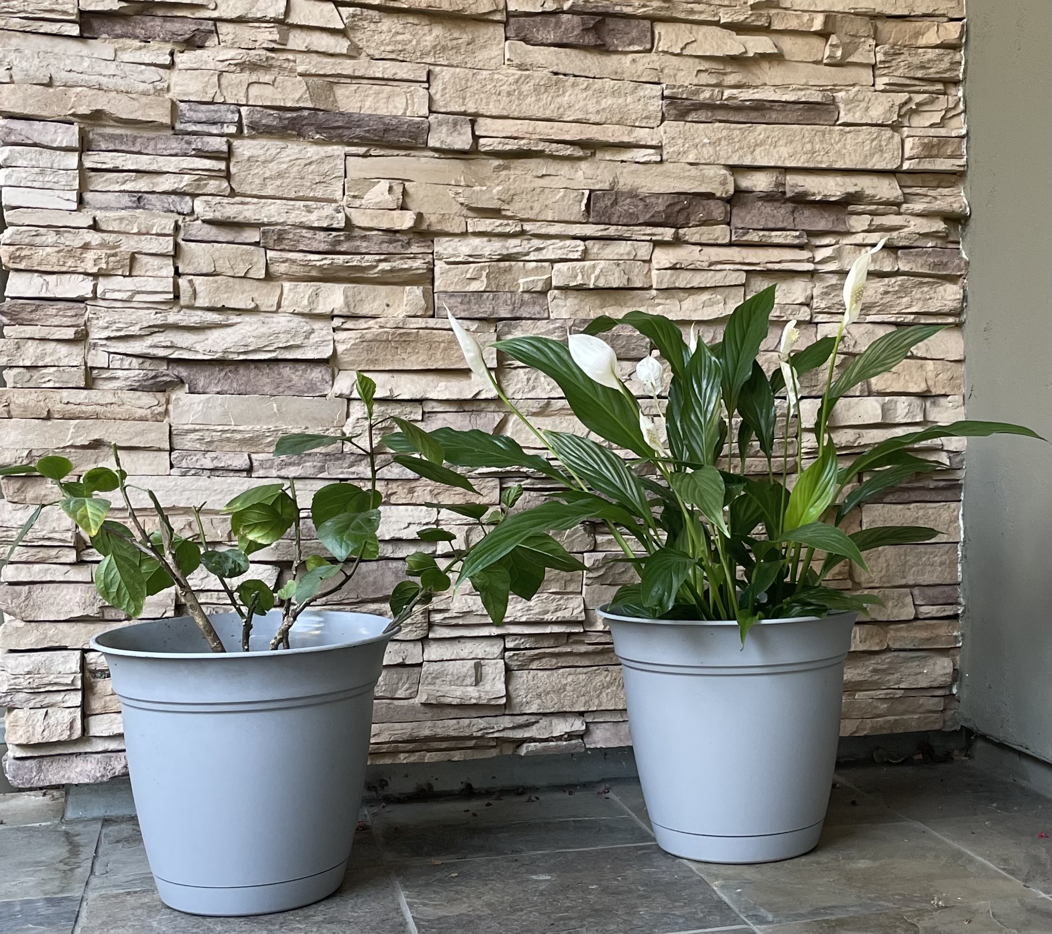 2022-09-27,我刚栽好的两盆植物(左边是扶桑,右边是Alex买的白鹤芋):