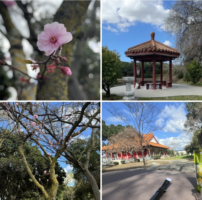 我随后开车到Overfelt Gardens把车停在限时两小时的路边免费停车位后,拿上零食和饮料来到梅亭。公园里游人很少,我一路走过只看到一个三口之家,年轻的父母陪公主着装的小女儿在玩耍。我最近开始做视频,所以带上刚买的与手机匹配的微型三脚架,心想也许可以在梅亭前做个小视频,这将是我的第一个室外小视频。
