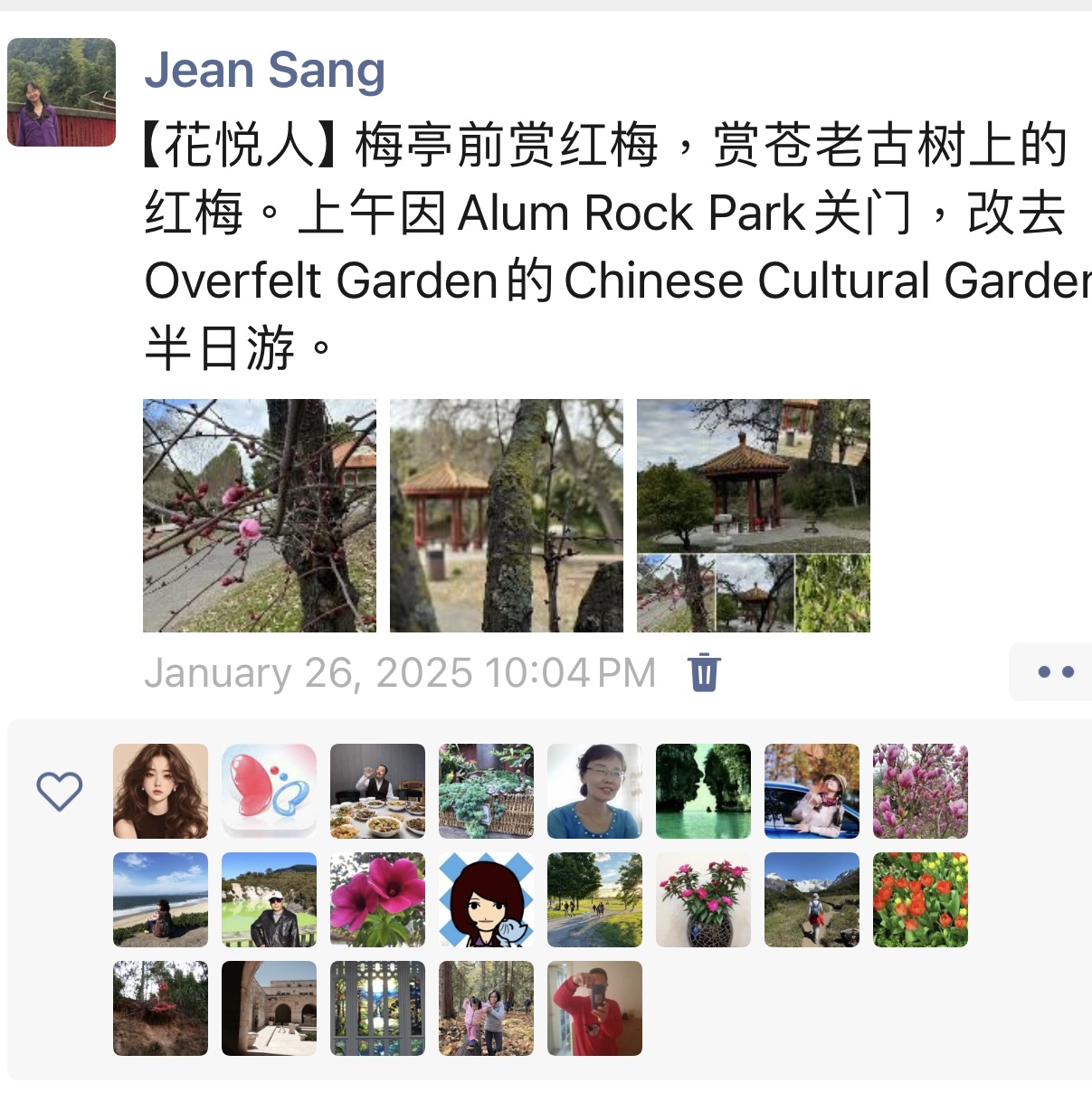 我想到已经是春暖花开的三月,傲立寒霜的红梅花期快过了;我一月底无意间去Overfelt中国文化公园喜见梅亭前有几株含苞的沧桑红梅树后还没有去赏过盛开的红梅花。【花悦人】梅亭前赏红梅,赏苍老古书上的红梅(2025-01-26)