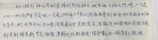 在八页家书中,爸爸在身临其境地描述奶奶最艰难的一段时间之前写道:“妈妈特别能吃苦耐劳,特别节俭能干。她曾两次陷入绝境,一次是1941-1943年严重旱灾时,一次是1943年7、8月从河南禹县到西安和在西安的两个多月。她没有文化,又从来没有离开过农村老家,在极度的困难和危险面前,却是那样果断、坚定、机智、勇敢地战胜困难,保护着儿女,确实令人敬佩。”