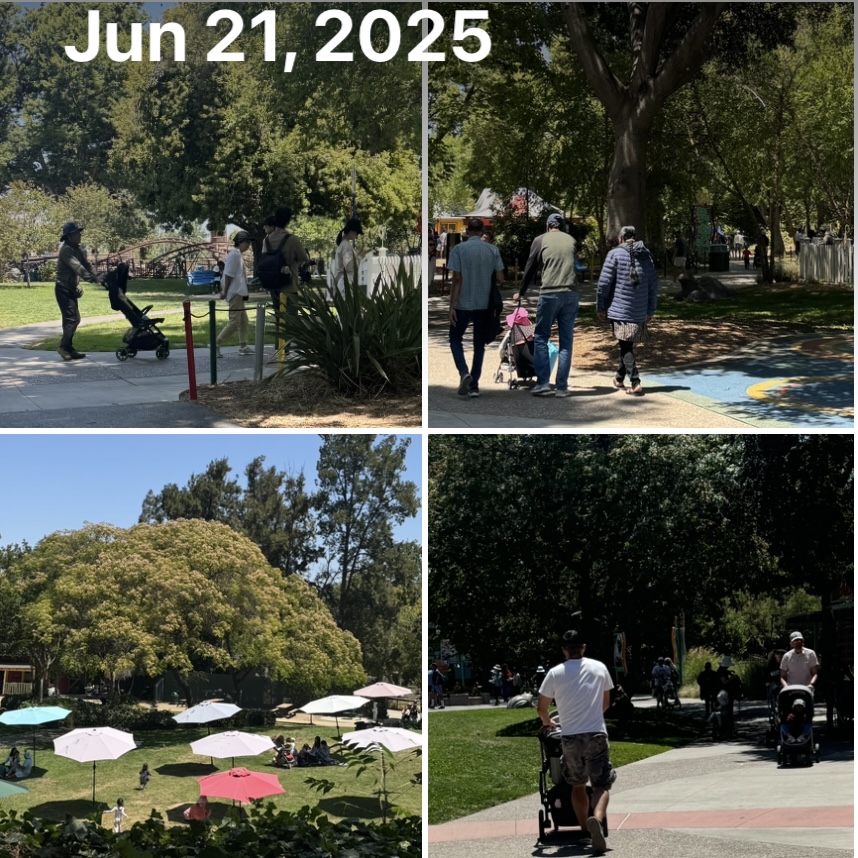 我在乐园溜达享受当外婆又不带宝宝的清闲味道散心,我看到好多年轻父母陪小宝宝和妈妈带着小孩来这里玩,也看到稀有的三代一个宝宝五口之家和四口之家以及父子俩,觉得人间生活真是多姿多彩。