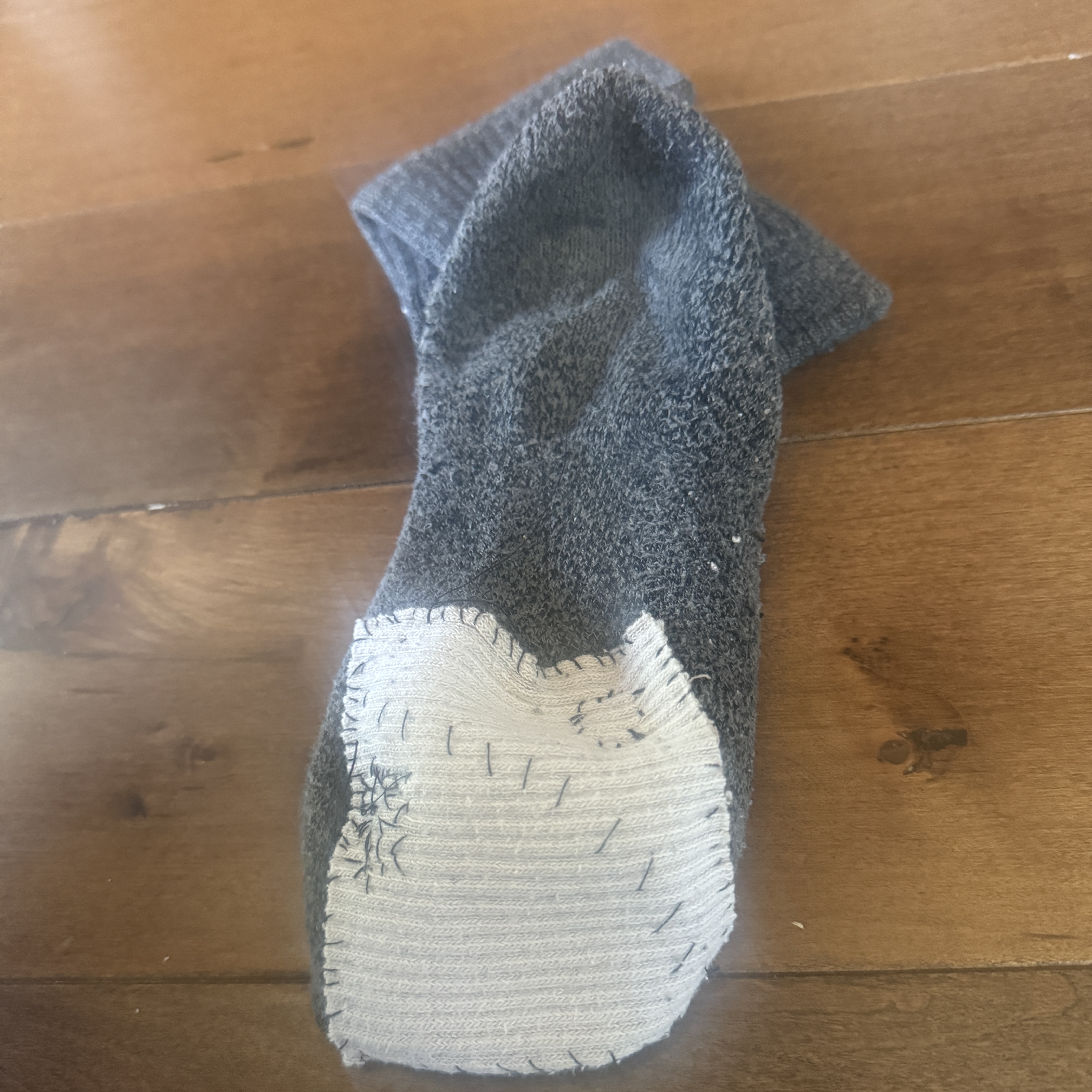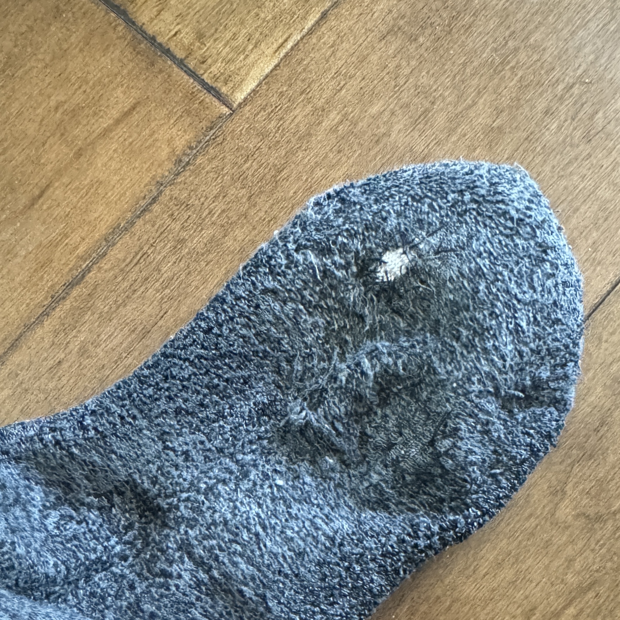 今天上午,我在示范补洞前给女儿解释选料和补洞。选旧袜子而不是布是因为袜子有弹性而布没有弹性,选几乎没有磨损的旧袜子筒会更耐磨因为袜底的洞是磨损出来的。把要补上去的袜料放在袜子表面,这样在袜子里面的脚掌不会有一高一低的感觉会舒服些,因为袜筒比较厚。