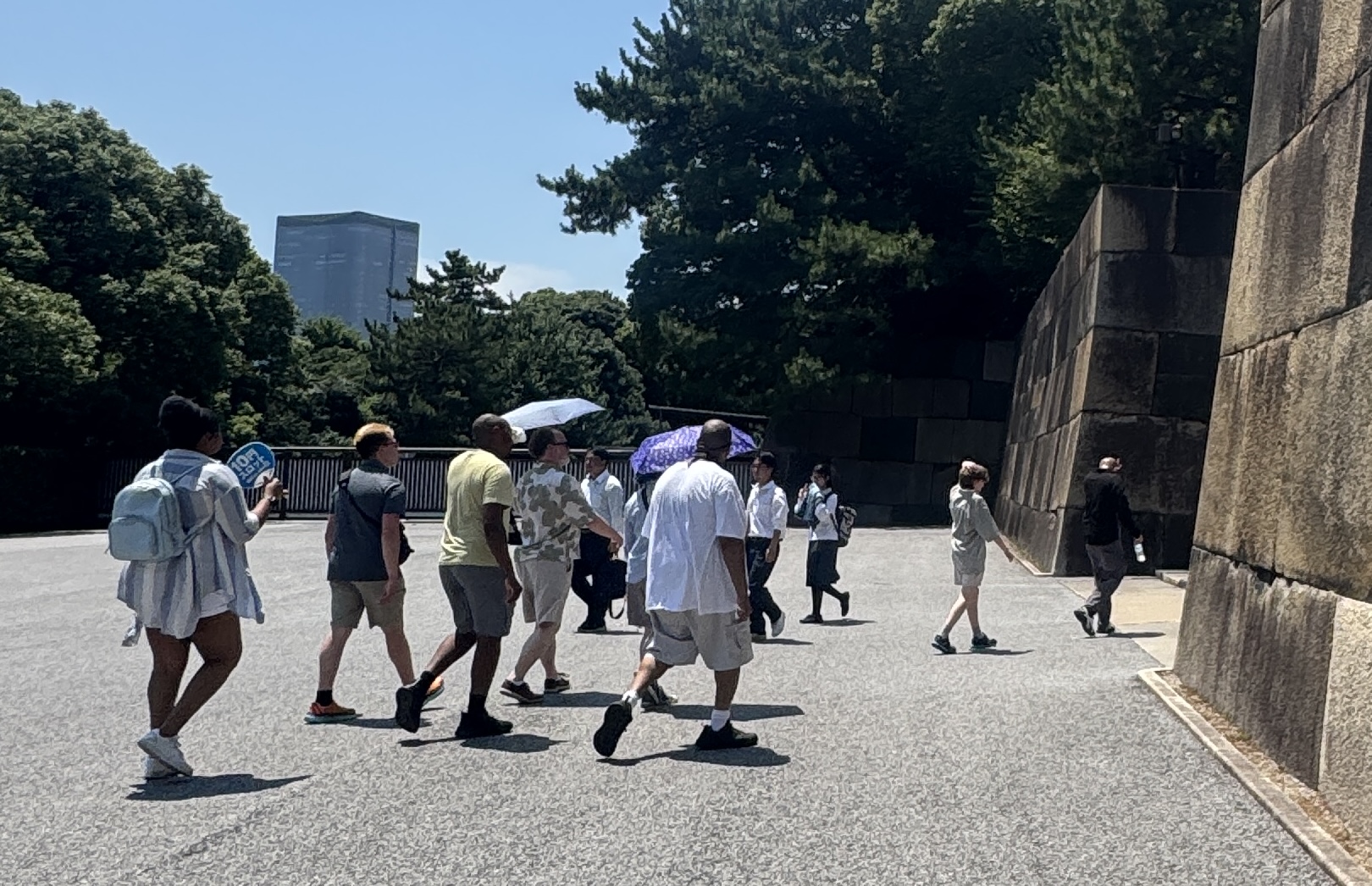 (我们团员参观皇居东御苑时一起走向大石墙。)