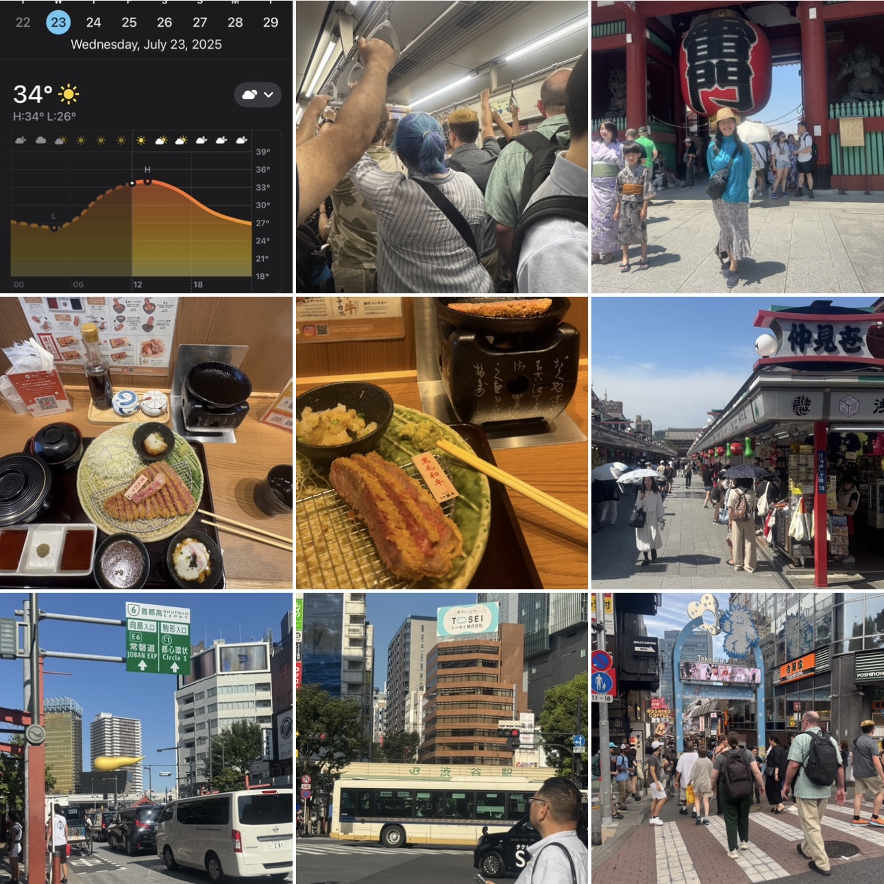 (天气、坐地铁、我在浅草寺、吃黑毛和牛午餐、逛仲见世、过涩谷十字路、在竹下通路口景集。)