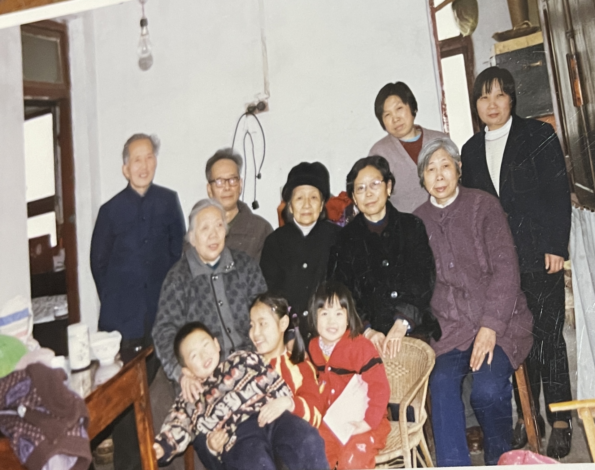 (前排:侄子凡凡、表妹袁琪、女儿艾琳,中排:妈妈、三舅娘、六孃、新四舅妈,后排:爸爸、四舅、永莲孃、七表嫂)