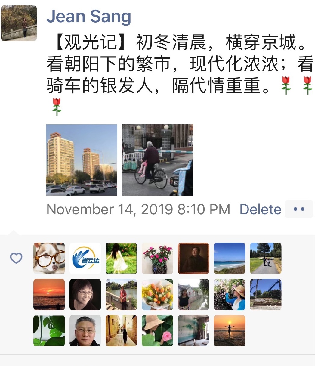 2019年11月13日,我买了单程票回去陪爸爸,准备给爸爸在北京找一个保姆,因为照顾爸爸的小舅妈要回自贡了。到北京的第二天,哥哥开车陪爸爸和我去看住养老院的大姑。在初冬清晨横穿京城,看朝阳下的繁市,现代化浓浓。看骑车的银发人,隔代情重重。