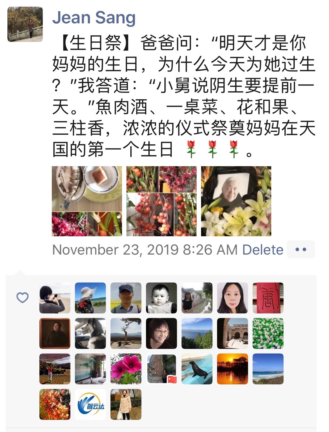 在自贡,小舅摆上鱼肉酒、一桌菜、花和果、三柱香提前一天为妈妈过第二个阴生日。爸爸问:“明天才是你妈妈的生日,为什么今天为她过生?”我答道:“小舅说阴生要提前一天过。”