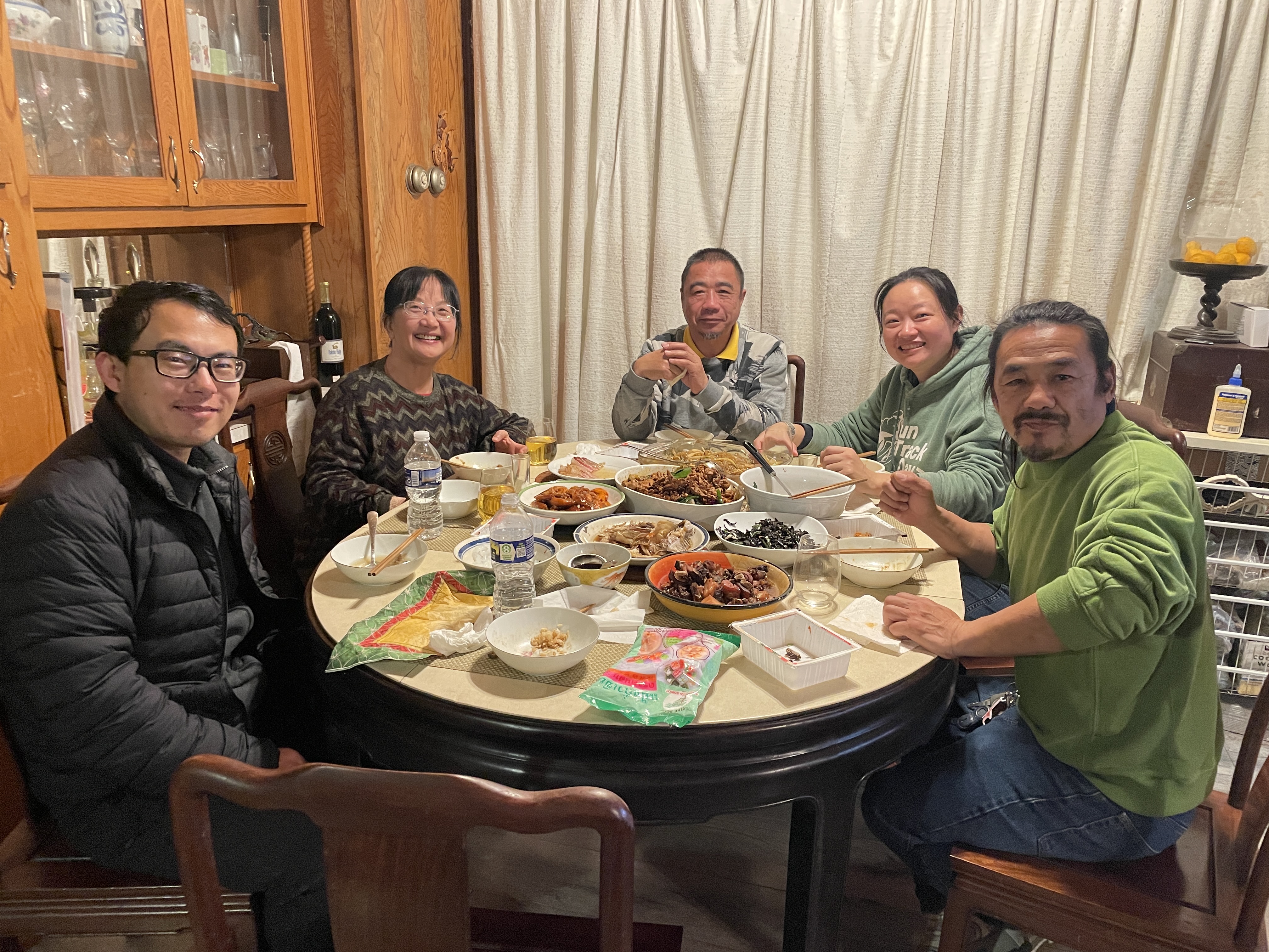 (晚餐桌上,从左到右:女婿、我,Sam,Liya,Jacky)