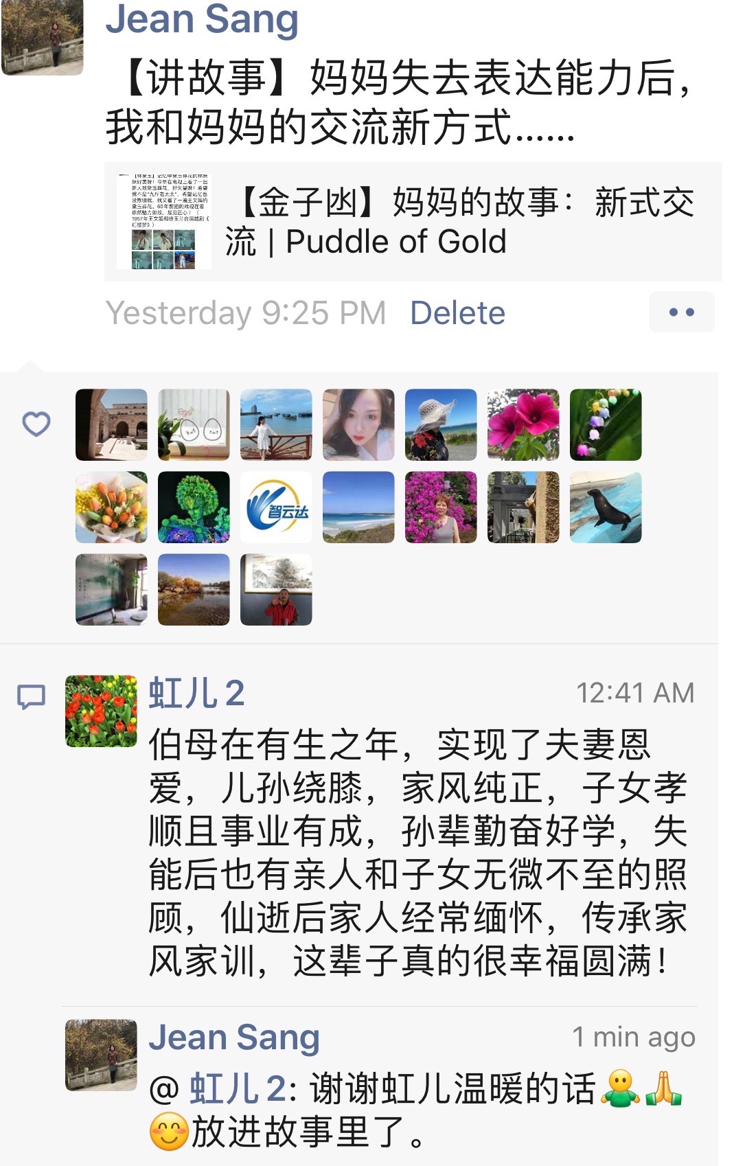 虹儿:伯母在有生之年,实现了夫妻恩爱,儿孙绕膝,家风纯正,子女孝顺及事业有成,孙辈勤奋好学,失能后也有亲人和子女无微不至的照顾,仙逝后家人经常缅怀,传承家风家训,这辈子真的很幸福圆满!